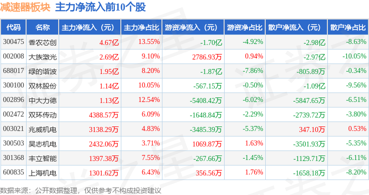 从资金流向上来看,当日减速器板块主力资金净流入10.35亿元,游资资金净流出4.16亿元,散户资金净流出6.19亿元。减速器板块个股资金流向见下表: